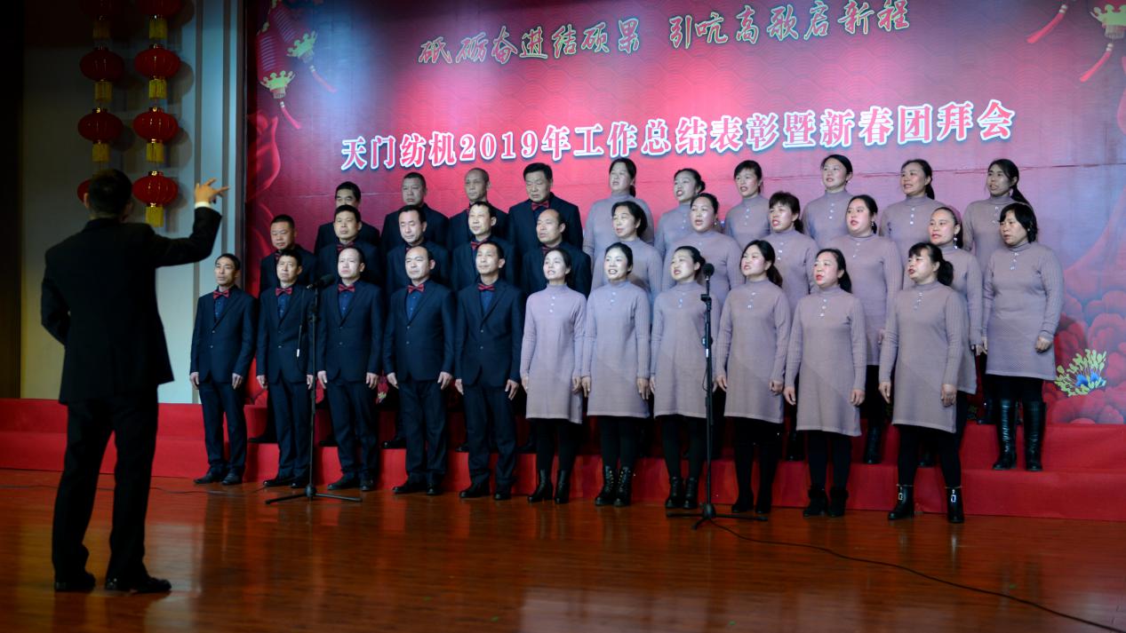 2020年1月21日下午,湖北天門紡織機(jī)械股份有限公司綜合樓多功能廳張燈結(jié)彩、暖流融融,一場主題為“砥礪奮進(jìn)結(jié)碩果、引吭高歌啟新程”的年度總結(jié)表彰暨新春團(tuán)拜會在這里舉行,400多名員工身著公司新佩發(fā)的西服套裝,精神奕奕地走進(jìn)會場。13:00整,三位主持人靚妝登場,宣布2019年度總結(jié)表彰暨新春團(tuán)拜會開始。