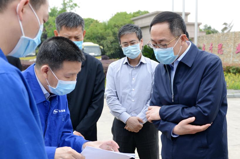 沈方勇董事長向國家衛(wèi)健委副主任于學軍(右1),國家衛(wèi)健委衛(wèi)生應(yīng)急辦公室監(jiān)察專員張國新(右2)等領(lǐng)導(dǎo)匯報天門紡機復(fù)工復(fù)產(chǎn)疫情防控情況