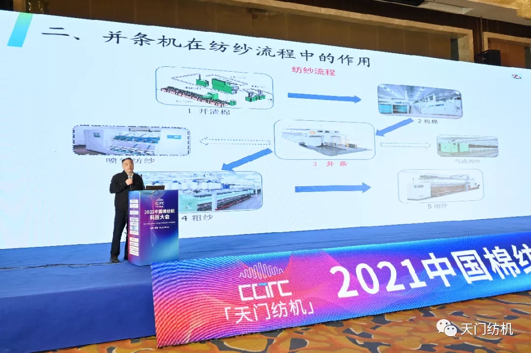 湖北天門紡織機(jī)械股份有限公司總經(jīng)理焦倫進(jìn)作了《并條機(jī)的創(chuàng)新與未來》的專題報告。在報告中,焦倫進(jìn)總經(jīng)理介紹了并條機(jī)在紡紗流程中的作用,并就目前紡織企業(yè)對并條機(jī)創(chuàng)新的要求,從傳動結(jié)構(gòu)及精度、加壓系統(tǒng)、牽伸裝置、清潔系統(tǒng)、部件及提供設(shè)備的數(shù)字化、信息化、智能化水平等方面進(jìn)行介紹。最后,焦倫進(jìn)總經(jīng)理指出未來并條機(jī)將向著梳并聯(lián)合、并粗聯(lián)、短流程一體機(jī)在技術(shù)上的突破方向發(fā)展。