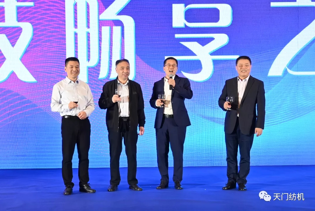 在12日的天門紡機(jī)“科技暢享之夜”答謝晚宴上,天門紡機(jī)總經(jīng)理助理?xiàng)钗姆逯略~。中國棉紡織行業(yè)協(xié)會會長董奎勇,天門紡機(jī)總經(jīng)理焦倫進(jìn),全國棉紡織科技信息中心主任、《棉紡織技術(shù)》期刊社社長劉強(qiáng),天門紡機(jī)總經(jīng)理助理?xiàng)钗姆骞餐瑸橥硌缱>啤?/span>