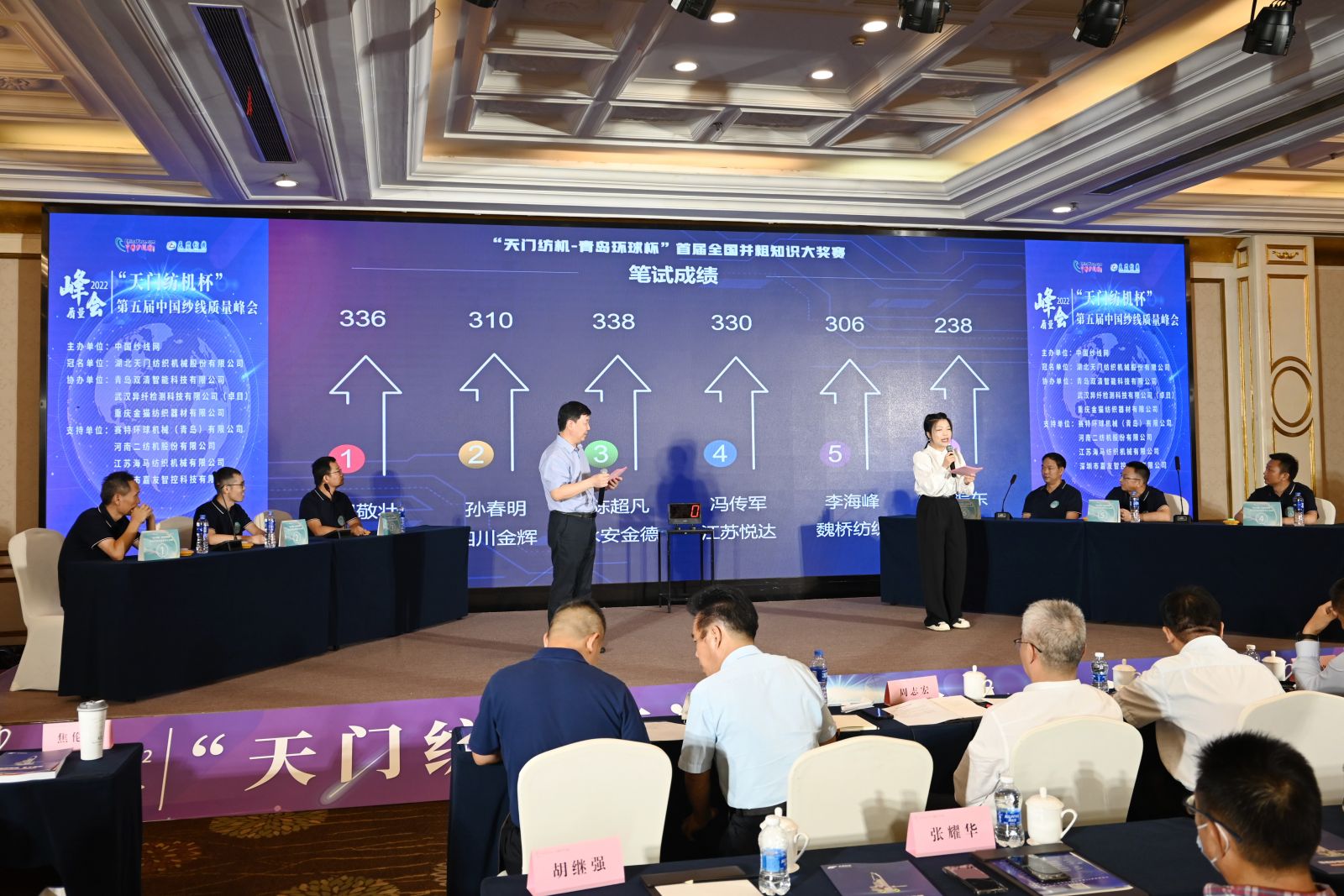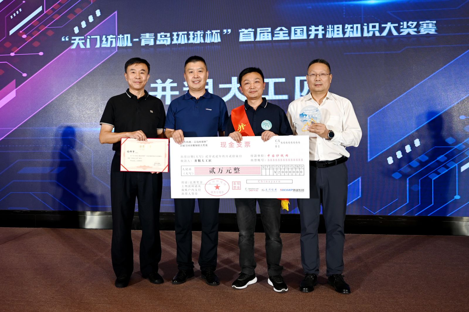 這是一場別開生面的競賽學(xué)習(xí)活動,6位選手的精彩表現(xiàn)不斷地贏得熱烈的掌聲,江蘇悅達(dá)馮傳軍以888分獲得“天門紡機(jī)-青島環(huán)球杯”首屆全國并粗知識大獎賽-爭霸賽冠軍,為歷時3個月的大賽活動劃上圓滿的句號。現(xiàn)場爭霸賽結(jié)束后,隆重舉行了頒獎活動,現(xiàn)場頒發(fā)“企業(yè)優(yōu)秀組織獎”、“并粗工匠獎”、“并粗大工匠獎”。天門紡機(jī)副總經(jīng)理肖少華、賽特環(huán)球營銷總監(jiān)陳濤、中國紗線網(wǎng)總裁鞠彥軍為大賽活動致辭并頒獎。