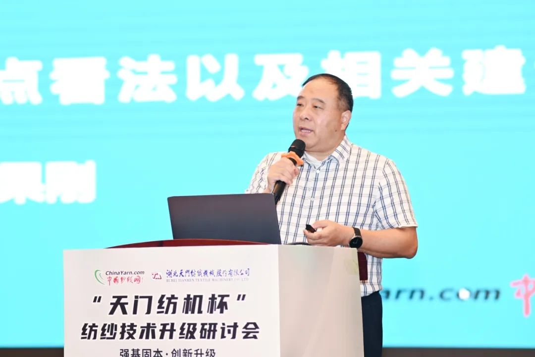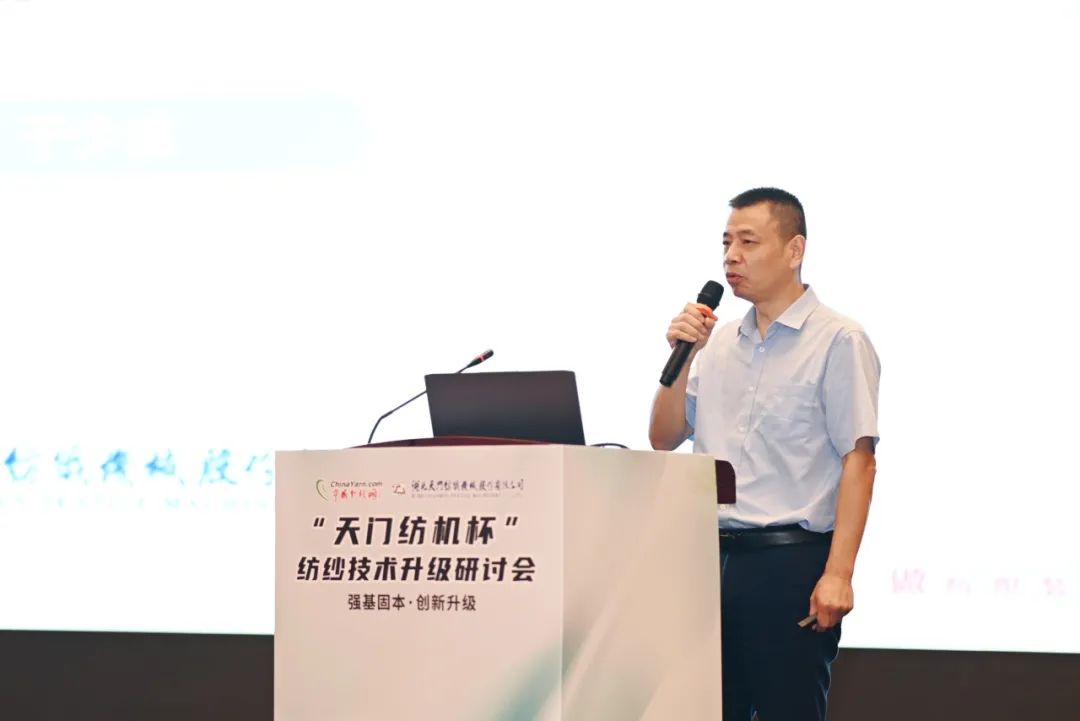 天門紡機(jī)總經(jīng)理焦倫進(jìn)向蒞臨會(huì)議的領(lǐng)導(dǎo)、嘉賓及長(zhǎng)期關(guān)心支持天門紡機(jī)發(fā)展的各界同仁朋友表達(dá)了誠(chéng)摯的謝意,他表示,天門紡機(jī)“生產(chǎn)制造柔性化、倉(cāng)儲(chǔ)物流自動(dòng)化、信息管理現(xiàn)代化”的5G+智慧工廠項(xiàng)目正在不斷向前推進(jìn),我們將通過(guò)自身的數(shù)字化轉(zhuǎn)型與智能化改造,為紡織企業(yè)數(shù)字化轉(zhuǎn)型和智能化改造持續(xù)提供裝備基礎(chǔ)。并作了題為《并條機(jī)的創(chuàng)新與應(yīng)用助力紡企高質(zhì)量發(fā)展》的專題報(bào)告。他交流了天門紡機(jī)堅(jiān)定不移走“專精特新”之路的工作經(jīng)驗(yàn),分享了勻整控制、在線監(jiān)控、5G+物聯(lián)網(wǎng)、自動(dòng)熱交換降溫系統(tǒng)等技術(shù)創(chuàng)新成果。